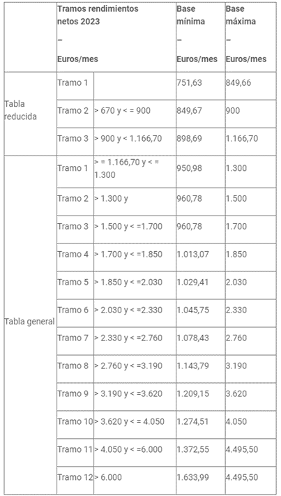 - Durante el año 2023, la tabla general y la tabla reducida, y las bases máximas y mínimas aplicables a los diferentes tramos de rendimientos netos, serán las siguientes: