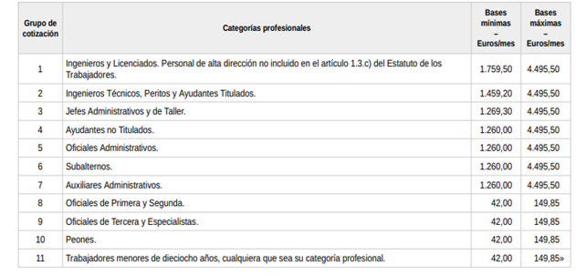 A partir del 1 de enero de 2023, serán de aplicación las siguientes bases máximas y mínimas de cotización: